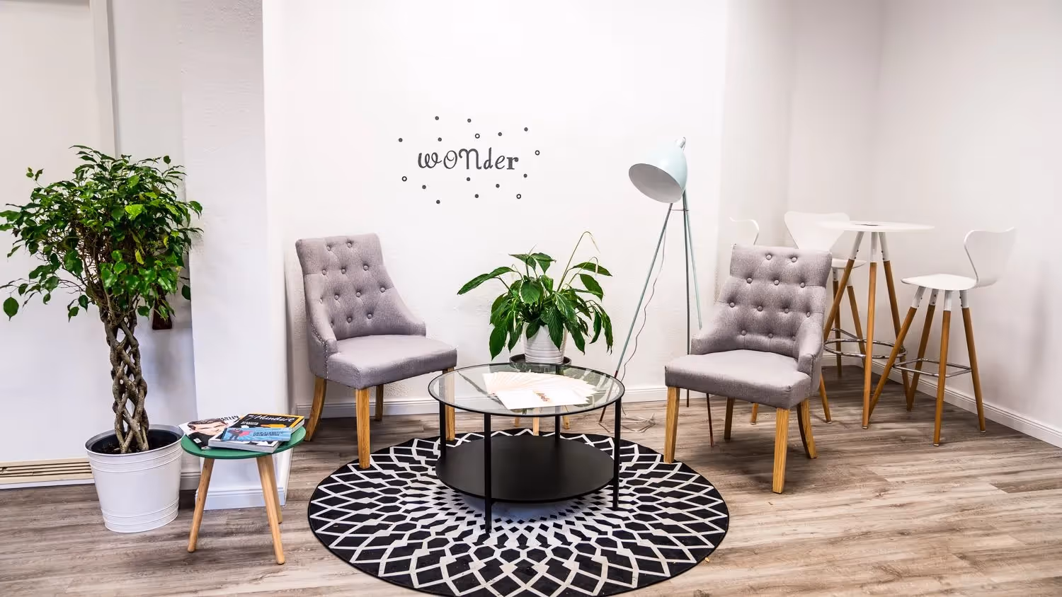 At Wonder, an Amapola location situated on Prenzlauer Allee 186, Berlin, you'll find the 'Prenzlauer' meeting room, comfortably accommodating up to 6 people. Its inviting setup includes a cozy corner with two armchairs and a table, making it an excellent option for coaching sessions. The room is fully equipped with a flipchart, whiteboard, and a projector with a screen, perfect for dynamic presentations.
