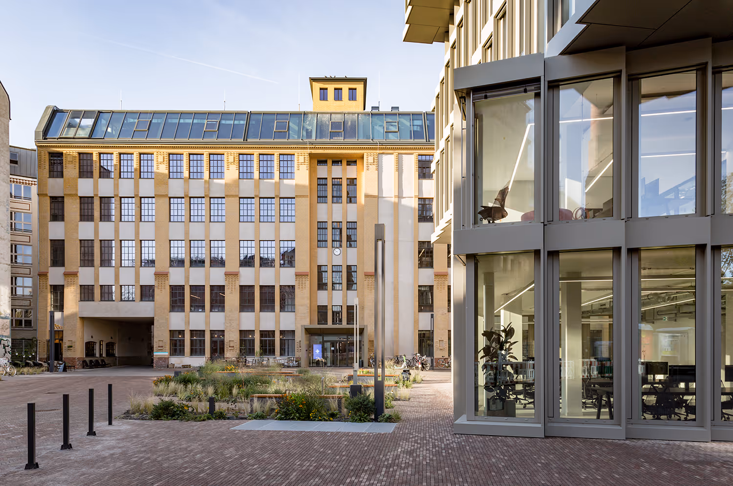 Access Techspace Eiswerk by finding the entrance labeled with the Techspace logo. Members have keycard access, and visitors should use the intercom for entry. Reception inside can provide additional help and direction